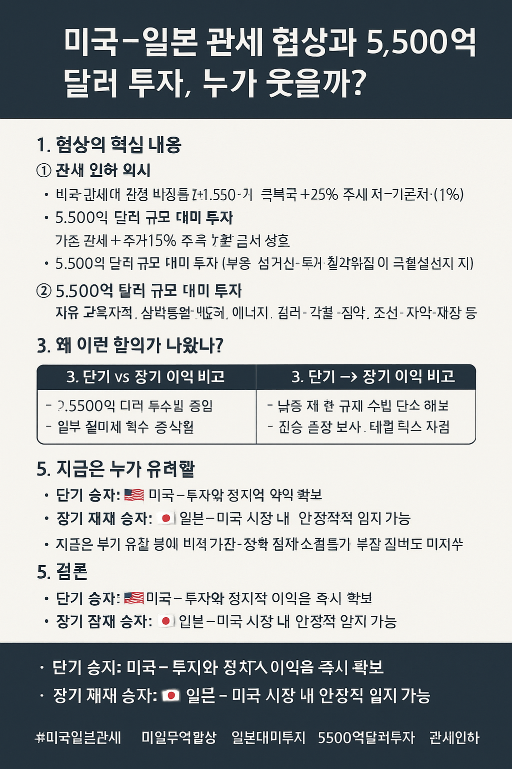 최근 미국과 일본이 체결한 관세 조정 + 대규모 투자 패키지가 전 세계 경제 뉴스의 중심에 섰습니다.