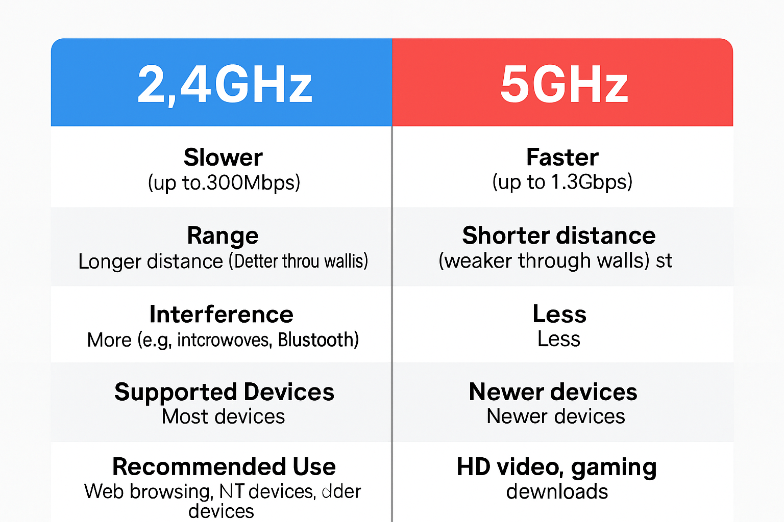 2.4GHz vs 5GHz Wi-Fi, 무선 주파수 차이 완벽 정리안녕하세요! 오늘은 우리가 집이나 사무실에서 자주 사용하는 Wi-Fi 무선 주파수 대역, 특히 2.4GHz와 5GHz의 차이에 대해 알아보겠습니다.요즘 무선 인터넷을 사용할 때 “2.4GHz 또는 5GHz 중 어떤 걸 써야 하나요?”라는 질문을 많이 받는데요, 각각 어떤 특징이 있고 어떤 상황에 더 적합한지 쉽게 설명해드릴게요.1. Wi-Fi 주파수란?먼저, Wi-Fi는 무선 신호를 보내고 받기 위해 주파수라는 전파의 진동수를 사용합니다. 이 주파수 대역이 바로 **2.4GHz(기가헤르츠)**와 5GHz입니다.GHz는 “초당 10억 번 진동”을 의미하는 단위로, 숫자가 클수록 신호가 빠르게 변한다는 뜻입니다.2. 2.4GHz 와 5GHz,..